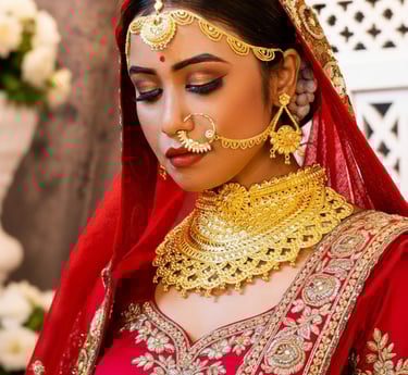 Our traditional bridal collection includes 22k gold bridal sets, Kundan bridal jewellery, temple jewellery necklaces, South Indian bridal sets, Polki bridal sets, Bengali bridal jewellery with Sakha Pola bangles and Bala bangles, mangalsutra necklaces, wedding bangles, bridal nose rings, maang tikka headpieces, and bridal waist chains.
